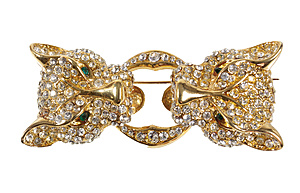Brosche, Metall goldfarben, signiert Bijoux Cascio, Italien, zwei Pantherköpfen im Doorknocker-Stil, plastisch ausgearbeitet, verziert mit klarem Strass und grünen Kristallaugen, ca. 67 x 28 mm
