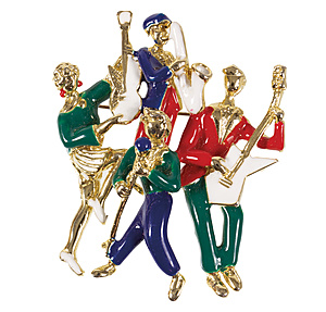 Brosche, Metall goldfarben, unsigniert, Band mit vier Musikern, farbig emailliert, plastisch ausgearbeitet , ca. 50 x 60 mm
