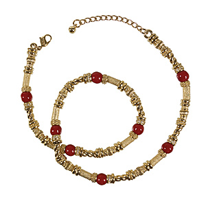Sommerliches Set, goldfarbenes Metall, unsigniert, Collier mit Klappschließe, B = ca. 2,0 cm, L = ca. 45 cm; Ohrclips, ca. 21 x 41 mm, rote und grüne Kunststoff-Verzierungen, z.T. mit klarem Strass, massive Ausführung !