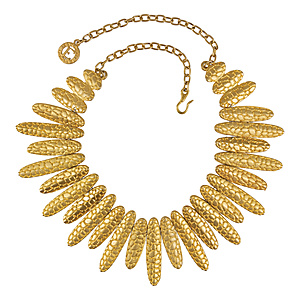 Etruscan collar necklace by ESCADA, flat gold colored metal with surface texture, signed on a label pendant, front: height = 47.5 mm, length = can be worn from c. 42 - 52 cm