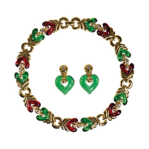 summer set, gold colored metal, not signed, necklace with folding clasp, width = c. 2.0 cm, length = c. 45 cm, ear clips, c. 21 x 41 mm, red and green plastic ornaments, partially with clear rhinestone, massive version !