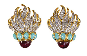 ear clips by ELIZABETH TAYLOR (signed), gold colored metal, from the series ETERNAL FAME, with colorless rhinestones, turquoise glass cabochons and a ruby-colored glass stone, c. 31.5 x 41.5 mm