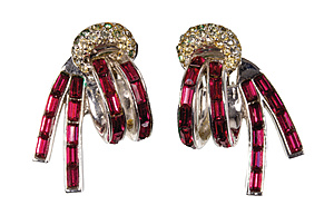 rare ear clips by MARCEL BOUCHER (student of Pierre Cartier), VINTAGE 1950s, metal white (rhodium-plated), signed: BOUCHER 3227, in several arches are red stones with baguette cut and colorless rhinestone, height = 33.0 mm