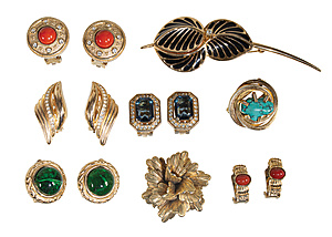 Lot: diverser Schmuck von GROSSE GERMANY, Metall goldfarben, 5 Paar Ohrclips mit Steinbesatz; 2 Broschen; 1 Nadel mit schwarzem Emaillelack, L = 102,7 mm