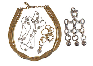 lot: sundry jewelry by GROSSE GERMANY, metal yellow/white, 2 delicate necklaces (one with pendant), 1 turned necklace, length = 39.0-42.0 cm, 1 decorative pendant with hanging balls, height = 110.7 mm