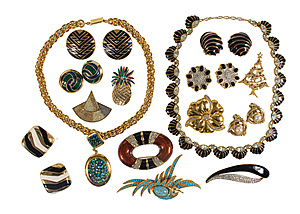 lot 15 pieces fashion jewelry: metal yellow/white, signed, among other things 1 Christmas tree signed GERRYS, height = 53.2 mm, a pair of ear clips signed NINA RICCI, set with white and black stones, diameter = 31.3 mm, 1 decorative bird signed SPINX, length = 100.0 mm, a pair of ear clips signed CINER black and creamcolored enamel coating, c. 32.5 x 32.5 mm, 1 necklace signed A&S, colorless rhinestone, black enamel coating, length = 48.5 cm, 4 more brooches, 4 pairs of ear clips, 1 pendant and 1 necklace (LOUIS TEROUD, ORENA PARIS, PB and other things)