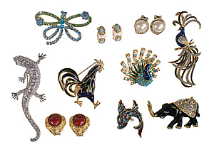 lot: metal yellow/white, 7 brooches shaped like animals, set with sundry stones, colored enamel coating, length = 30.5 - 103.0 mm, 3 pairs of ear clips, all not signed