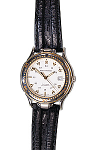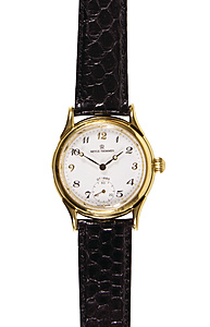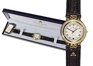 Damen-Armbanduhr, MAURIX LACROIX, Quarz, Gold plattiert, weißes Ziffernbl. mit röm. Index, zent. Sek., Dat. auf 6 Uhr, ged. Boden, D = 25,5 mm, orig. Lederband mit Dornschließe, Uhr läuft ! mit Schatulle.