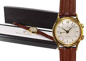 men's wristwatch, REVUE THOMMEN, Cricket Alarm, alarm clock, manual winding, gold plated stainless steel , cream-colored clock-face, put on hours bar, central second, hand for alarm function, screw back, diameter = 35.0 mm (without crown), reference: 7922001, Cal. MSR 79, leather watchstrap with pin buckle, very good condition, unworn, watch is running !