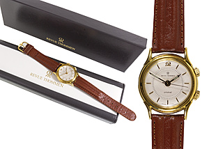 men's wristwatch, REVUE THOMMEN, GT 1885, manual winding, gold plated stainless steel, cream-colored clock-face, Roman numerals, small second on 6 o'clock, screw back made of glass, diameter = 35.0 mm (without Krone), onion crown, Mod. N° 8122002, Cal. MSR 79, original leather watchstrap with pin buckle, very good condition, watch is running ! with casket