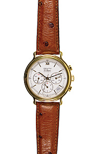 men's wristwatch, ZENITH (El Primero), Switzerland 1990s, chronograph, self-winding, 18 ct gold plated, white clock-face, displays hours, minutes, small second, date (on 4 past 30), glass bottom, diameter = 38.0 mm (without crown), reference: 20.0140.400, cal.: 400, fine adjustment, leather watchstrap with pin buckle, very good condition, watch is running !