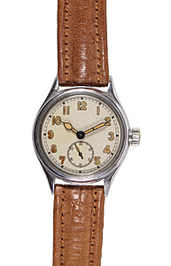 military watch, BULOVA, manual winding, Arabic index, small second on 6 o'clock, screw back, diameter = 31.8 mm, caliber USA mid 1930s (17 jewels), leather watchstrap with pin buckle, watch is running !