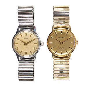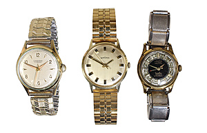 lot: 3 men's wristwatches from the middle of the 20th century, 1 ARCTOS NEON NIVAFLEX, central second, screw back, diameter = 33.0 mm, 1 JUNGHANS, self-winding with central second, screw back, diameter = 33.0 mm, 1 BERGAMA yellow gold 585/000 (case), manual winding, central second stick index, snap off case back, diameter = 33.8 mm, straps: steel/gold plated steel, watches are running!