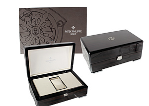 Uhrenschatulle, PATEK PHILIPPE für Nautilus Aquanaut (ewiger Kalender), fein gemasertes Holz mit Metallfüßen, ca. 23,5 x 9,5 x 15,0 cm, mit Umkarton, sehr guter Zustand !