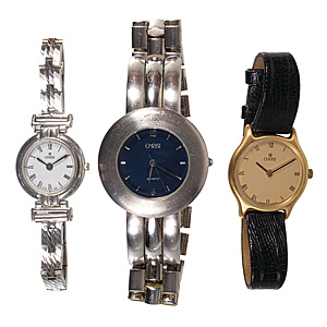 Lot: 3 Damen-Armbanduhren von Christ, Quarz, 1 x blaues Ziffernblatt mit Strichindex, zent. Sek, D = 32,0 mm, Band zur Hälfte als Spange, Uhr läuft ! 1 x verg., röm. Zahlen, D = 22,0 mm, Lederband mit Dornschließe; 1 x röm. Zahlen, D = 19,5 mm, Stahlband, beide ungeprüft !