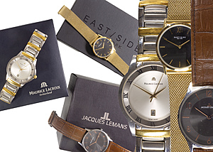 lot: 3 men's wristwatches, 1 x MAURICE LACROIX, steel gold, diameter = c. 40.0 mm, steel strap with folding clasp, 1 x JAQUES LEMANS, leather watchstrap with pin buckle and 1 x EAST SIDE New York, gold-colored metal , unchecked !