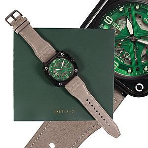 Herren-Armbanduhr, OLTO-8 IRON X GREEN, Automatik, grünes Ziffernbl., durchbrochen gearbeitet, Saphirglas, rückseitig mit Sichtfenster, verschr. Boden, ca. 46,0 x 43,0 mm, Kal. Miyota 8257, Kunst-Lederband mit Dornschließe, Uhr läuft ! Mit Schatulle u. Papieren, ungetragen !