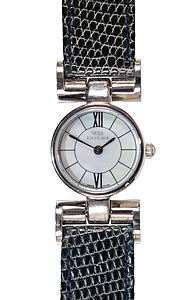 Ladies wristwatch, ENIGMA created by GIANNI BULGARI, steel, quartz, mother of pearl clock-face, diameter = 20.0 mm, Ref. 603.300S, original leather watch strap with pin buckle, as good as new from a liquidation !