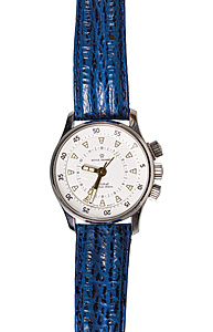 men's wristwatch, REVUE THOMMEN (Alarm), cricet nautical 200 m, manual winding, stainless steel, white clock-face, Arabic numerals, central second, screw back, diameter = 38 mm (without crown), reference: 79100001 LIMITED EDITION 0529/2400, original sharkskin leather watchstrap with pin buckle, very good condition (bracelet inside with traces of decoration), watch is running !