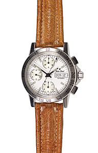 men's wristwatch, JEAN PAUL, chronograph, steel, self-winding, white clockface, line index, day/date on 3 o'clock, displays the second, minute and hours, tachymeter scale, diameter = 37.5 mm (without crown), leather watchstrap with pin buckle, unworn, watch is running !