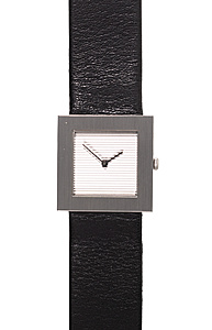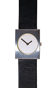 Damen-Armbanduhr, VENTURA 1990er Jahre, UHR 2 by Gunther WERMEKES, Stahl, Quarz, weißes Ziffern.-Blatt, Saphirglas, verschr. Boden, Gehäuse ca. 25,2 x 30,0 mm, H = 4,6 mm, original Lederband mit Dornschließe, mit Schatulle, ungetragen, aus Auflösung !