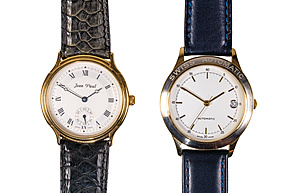 lot: 2 men's watches, 1 x JEAN PAUL, quartz, structured clock-face, small second on 6 o'clock, 1 x DUBOIS, self-winding, central second, date on 3 o'clock, both steel/gold, snap off case back, leather watchstrap with pin buckle, unworn, from a liquidation !