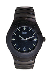 Herren-Armbanduhr, Quarz, Stahl geschwärzt, Piquot MERIDIEN, zent. Sek., Dat. auf 6 Uhr, Strichindex, verschr. Boden, D = 36,3 mm, Metallband mit Faltschließe, ungetragen, Uhr läuft !