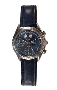 men's wristwatch, OMEGA chronograph 1990-1999, Triple Speedmaster, self-winding, steel, blue clockface, small second, date, calendar, sapphire glass, diameter = 39.0 mm, Ref. 3523.8, leather watchstrap with folding clasp, traces of usage, watch is running, original box