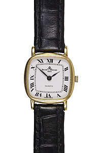 Ladies'-wristwatch, quartz, yellow gold 750/000, signed BAUME & MERCIER, white clockface, Roman index, blued hands, diameter = 20.7 mm, leather watchstrap with pin buckle, watch is running !