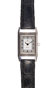 Ladies'wristwatch 1995, JAEGER LE COULTRE Reverso Classique, manual winding, steel, silver colored clockface, Arabic index, blued hand, sapphire glass, case c. 19.6 x 28.5 mm, Ref. 260.8.230, leather watchstrap with pin buckle (plus second original ostrich leather watchstrap), traces of usage, with receipt, original case with cardboard box, (good working, watch gains time), watch is running !