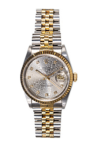 Herren-Armbanduhr, ROLEX OYSTER PERPEDUAL DATE JUST (Chronometer), Stahl/Gold, graues Ziffernblatt komplett mit Rolex Schriftzug verziert, Zent. Sek., Dat. unter Lupenglas, Index mit Diamantbesatz, verschr. Krone, verschr. Boden, D = 34,6 mm (ohne Krone), Kal. 3135, Mod. 16233, Ref. X941627, Werk-Nr 6523283, Stahl/Goldband mit Faltschließe, mit Zertifikat, Uhr läuft !