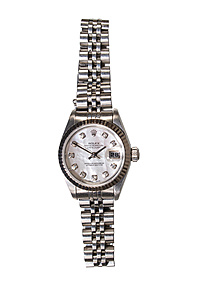 Damen-Armbanduhr, ROLEX OYSTER PERPEDUAL DATE JUST 79174(Chronometer), Automatik, Stahl, Perlmutter-Ziffernblatt, Zent. Sek., Dat. unter Lupenglas, Index mit Diamantbesatz, Saphirglas, Lünette: Weißgold, verschr. Krone, verschr. Boden, D = 26,0 mm (ohne Krone), Kal.2235, Mod. 79174, Ref. A454264 (Garantiekarte vom 25.03.2000), Stahlband mit Faltschließ, Uhr läuft !