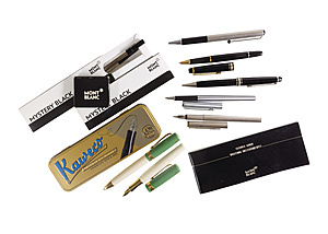 miscellaneous writing utensils by MONT BLANC, 2 retractable ballpoint pens, MEISTERSTÜCK PIX, length = 137.5 and 138.0 mm, 1 more retractable ballpoint pen (without ball pen refill), 1 silver-colored ballpoint and 1 fountain pen with white gold 585/000 nib ( (at one end is the insert missing ), 2 boxes ballpoint (a 2 pieces) and a pair of ink cartridges, always 1 fountain pen and 1 ballpoint by KAWECO in a metal casket