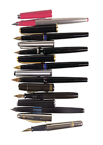 lot: various writing utensils, 2 x signed LINDAUER W.GERMANY, 1 x PELIKAN W.GERMANY, 1 x ARTUS, Artus-Ballit, 2 x with gold nib yellow gold 585/000, 1 x signed BRAUSE and 1 x signed GEHA, all are piston fountain pens, 1 x fountain pen with cartridge, unchecked !