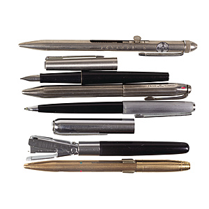 lot: various writing utensils, 1 x four color ballpoint pen (gold-colored), signed FEND SUPER NORMA WALZGOLD, 1 x four color ballpoint pen (silver-colored), signed FEND 900 Germany, 1 x Parker fountain pen, 1 PELIKAN ballpoint, 1 stapler shaped like a fountain pen, signed STAPLER DUO FAST, length = c. 13.5 cm, whimsical ! 1 special pen by BAYER, back with brush and front with steel pin, length = c. 13.8 cm, all unchecked !