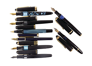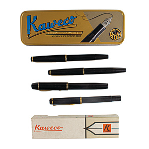 lot writing utensils: 1 piston fountain pen by SENATOR with gold plated iridium nib, 2 piston fountain pens by KAWEKO, 1 piston fountain pen by PELIKAN, 2 original caskets