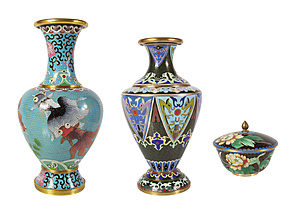 2 Chinesische Cloisonné Vasen u. 1 Deckeldose, teilweise verg., 20.Jhd., 1 Vase mit farbigen Fischen dekoriert H = 26,0 cm; 1 Vase mit gespiegelten Motiven; 1 Deckeldose mit floralen Motiven D = ca. 10,0 cm, alle in gutem Zustand !