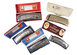 lot: 5 mouthorgan by Hohner, MADE IN GERMANY, 28 Loch, 4 UNSERE LIEBLINGE in different sizes, 1 COMET, all in the original casket !