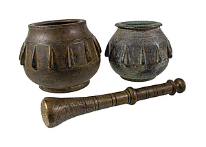 Lot: 2 Spanisch/Maurische Mörser 17/18.Jhd., Bronze mit antiker Patina, kugelige Form mit abgesetztem Fuß, eingezogener Rand, Wandung durch Rippen gegliedert, D = 11,5 u. 12,5 cm, für größeren Mörser ein Stößel