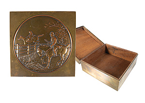 casket first half 20th century, brass/copper, signed Straus WMF, rider scene inside lined with wood