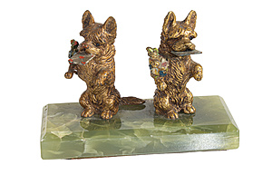Vienna bronze around 1900/10, paperweight, 2 terriers with letters in the snout and flowers in the arm, colored painted (worn), green alabaster base, width = 88.5 mm, height = 61.5 mm