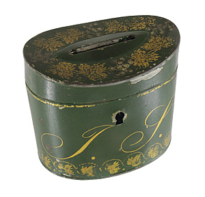 Ovale Spardose 1.Hälfte 19.Jhd., Blech grün grundiert mit Goldstaffage (berieben), H = 8,2 cm, mit Schlüssel