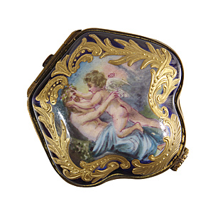 Dose, 1870/80er Jahre, sig. CHEVRE, zentrale erotische Szene, Porzellan blau emailliert, Goldstaffage, Scharnierdeckel, ca. 59,3 x 55,5 mm, H = 34,7 mm