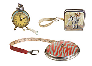 tape measure, small alarm clock around 1900, case with worked intotape measure, green celluloid, height = c. 54.5 mm,