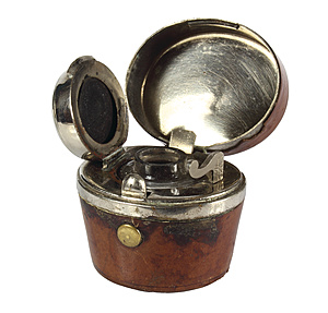 travel inkpot around 1830/50, shaped like a hatbox, white metal, signed: K.K.PR… with an eagel with two heads (brand), case is covered with leather, hand blown glass, barrel-cover with shutter mechanism, height = c. 45.0 mm, leather is worn !