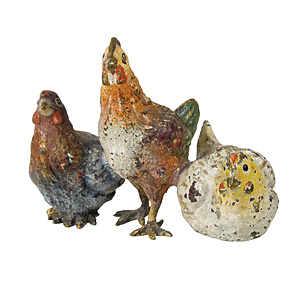 WIENER BRONCE um 1900/10, 3 HÜHNER, farbig bemalt (leicht berieben), vollplastisch ausgearbeitet, H = 3,5 cm