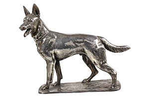 SCHÄFERHUND auf Sockel, WMF, Design: FRITZ DILLER 1875-1946, sig. WMF l/O H (versilbert), B = 17,0 cm, H = 15,0 cm, vollplastisch ausgearbeitet, schöne Patina !
