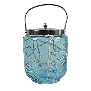 Keksdose, JUGENDSTIL um 1900, wohl PALME & KÖNIG, Metall weiß, über die gesamte Wandung laufen unregelmäßige weiße Fäden (typisches Merkmal der Fa. Pallme & König), transparentes Glas mit partiell blauer Einfärbung, Deckel u. beweglicher Henkel, H = 22,5 cm, D = 13,5 cm