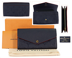 LOUIS VUITTON, Geldbörse, Modell: Sarah Monogram Empreinte Leder, genarbtes dunkelblaues Leder mit Monogram Prägung und Überschlag, Innenfutter aus genarbtem Rindsleder, goldfarbene Beschläge, Druckknopf-Verschluss, 2 gr. Innenfächer, 1 Münzfach mit Reißverschluss, 1 flaches Innenfach, 16 Kartenfächer, B: 19 cm, H: 10,5 cm, T: 2 cm, mit Orig.-Rechnung von LV-Frankfurt, Orig.-Staubbeutel, orig.-Kart., minim. Gebrauchsspuren am Druckknopf, sonst neuw. Zust.