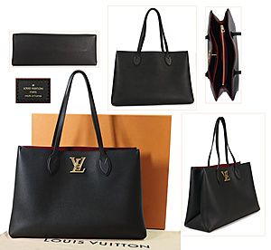 LOUIS VUITTON, Handtasche, Modell: Lockme Shopper, schwarzes genarbtes Kalbsleder, dunkelrotes Mikrofaserinnenfutter, goldfarbene Metallelemente, flaches Innenfach mit LV Verschlusssystem, 1 Hauptfach mit Reißverschluss, 2 Innenfächer, 2 Schulterriemen, L: 38 cm, H: 26,5 cm, B: 13 cm, mit Orig.-Rechnung von LV München, Orig.-Staubbeutel, Orig.-Kart., Orig. Einkauftasche, neuw. Zustand